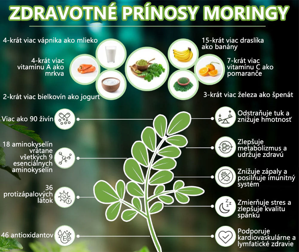 Moringa: Moringa je prírodná výživová bomba podporujúca chudnutie a celkové zdravie. Obsahuje bielkoviny a všetky esenciálne aminokyseliny, čo ju robí vynikajúcim rastlinným zdrojom bielkovín. Bohatá na vitamíny A, C a E, pomáha zlepšovať zrak, imunitu a tvorbu kolagénu. Poskytuje vápnik, železo a draslík na podporu zdravia kostí a srdca. Antioxidanty znižujú zápal a vláknina podporuje trávenie a reguláciu hladiny cukru v krvi. Moringa tiež podporuje tvorbu GLP-1, čo pomáha potláčať hlad a podporovať chudnutie.