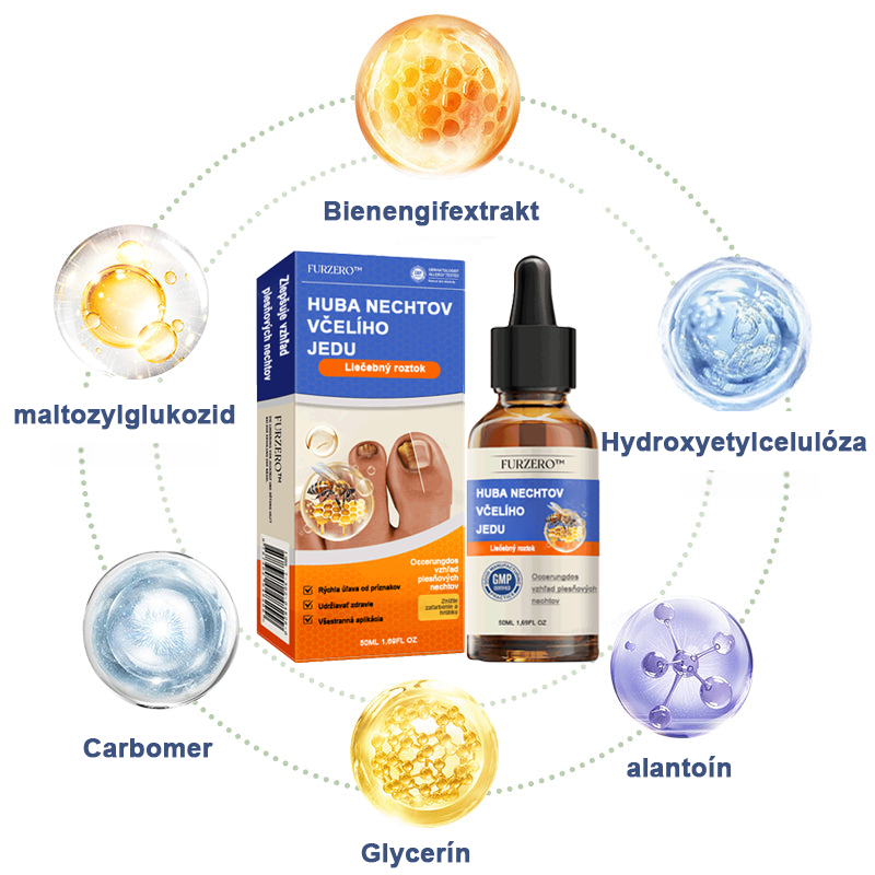 Furzero™ roztok na liečbu plesní nechtov s včelím jedom je účinným riešením na liečbu rôznych problémov s nechtami. Všetky zložky pochádzajú z prírodných rastlín a sérum má zloženie s aktívnym včelím jedom a prírodnými výťažkami. Toto sérum hlboko preniká do nechtov a nechtovej kožičky, odstraňuje odolné plesne, zlepšuje zdravie nechtov a podporuje ich rýchly rast. Jeho silné antibakteriálne a protiplesňové vlastnosti účinne zabraňujú infekciám a posilňujú nechty, čím sa stávajú odolnejšími. Furzero™ sa ľahko používa a je vysoko účinný, predstavuje bezpečnú, prirodzenú a neinvazívnu metódu obnovy zdravých a krásnych nechtov.